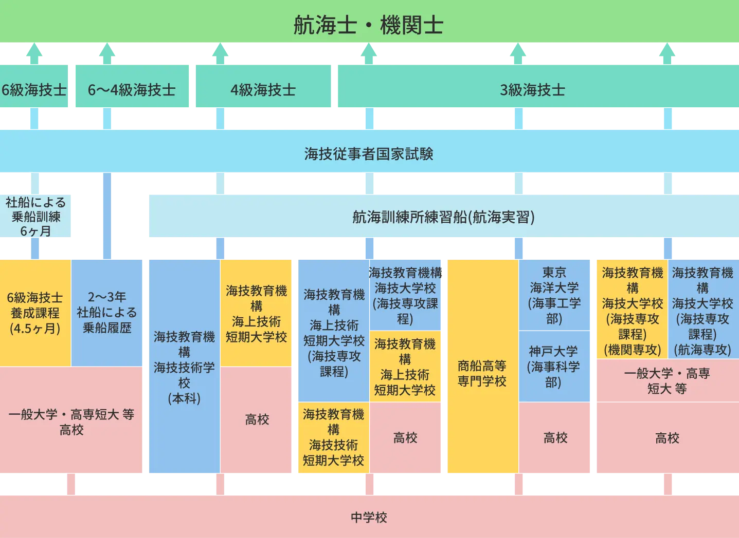 座学(2.5ヶ月)と乗船実習(2ヶ月)を修了し、社船による乗船履歴6ヶ月修了後、海技試験を受け、